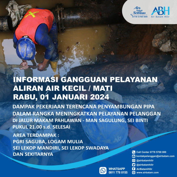 TRANSKEPRI.COM. BATAM - Air Batam Hilir menginformasikan, dampak pekerjaan terencana Penyambungan Pipa di Jalur Makam Pahlawan – MAN Sagulung, Sei Binti, yang bertujuan untuk meningkatkan pelayanan pelanggan dan akan dilakukan pada :