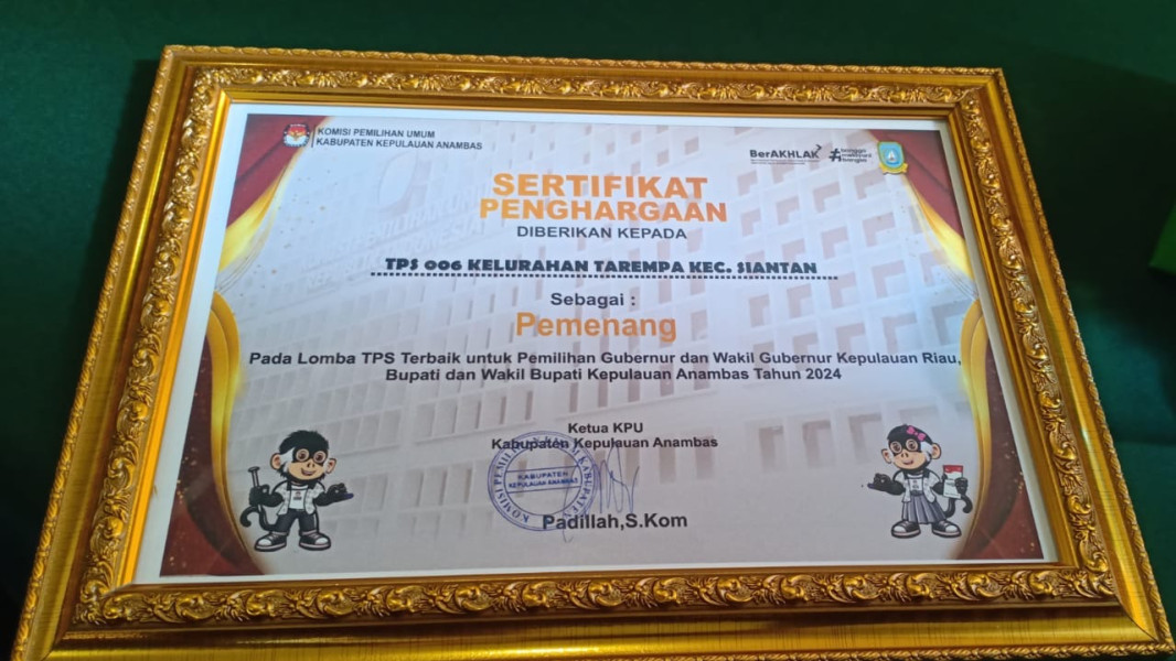 TRANSKEPRI.COM.ANAMBAS- Tempat Pemilihan Suara (TPS) 006 Kelurahan Tarempa Kecamatan Siantan meraih piagam penghargaan dari Komisi Pemilihan Umum Daerah (KPUD) Kabupaten Kepulauan Anambas (KKA) sebagai pemenang lomba TPS pada pemilihan Gubernur dan Wakil Gubernur Kepulauan Riau Bupati dan Wakil Bupati Kabupaten Kepulauan Anambas yang digelar 27 November 2024 silam, hal itu disampaikan Syamsir Lurah Tarempa Minggu (26/1/2024).