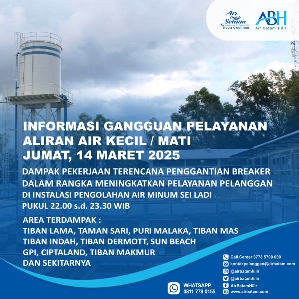 TRANSKEPRI.COM. BATAM - Air Batam Hilir menginformasikan, pelaksanaan pekerjaan terencana Penggantian Breaker Incoming Intake Phase 2 di Instalasi Pengolahan Air Minum Sei Ladi, yang bertujuan untuk meningkatkan pelayanan pelanggan dan akan dilakukan pada :