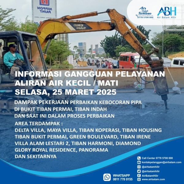 TRANSKEPRI.COM. BATAM - Air Batam Hilir menginformasikan, dampak pekerjaan Perbaikan kebocoran Pipa DN 300mm di Bukit Tiban Permai, Tiban Indah dan saat ini dalam proses perbaikan.