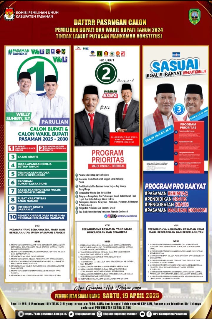 KPU Pasaman resmi menetapkan tiga pasangan calon Bupati dan Wakil Bupati sebagai peserta dalam Pemilihan Suara Ulang (PSU) Kabupaten Pasaman Tahun 2025. (ist)
