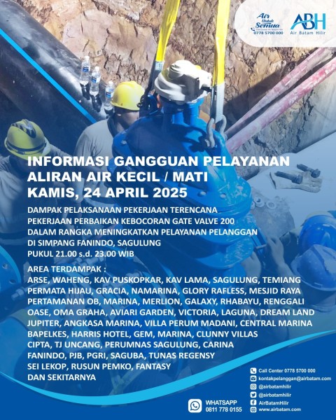 TRANSKEPRI.COM. BATAM - Air Batam Hilir menginformasikan, pelaksanaan pekerjaan terencana perbaikan kebocoran gate valve 200 di Simpang Fanindo, Sagulung yang akan dilakukan pada :