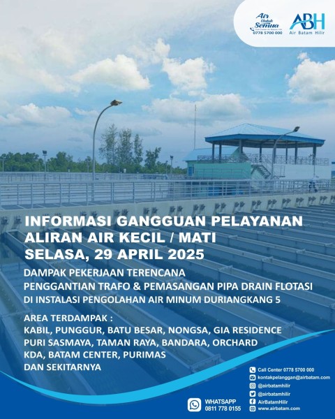 TRANSKEPRI.COM. BATAM - Air Batam Hilir menginformasikan, pelaksanaan pekerjaan terencana penggantian trafo dan pemasangan pipa drain flotasi DK5 di Instalasi Pengolahan Air Minum, Duriangkang yang akan dilakukan pada :