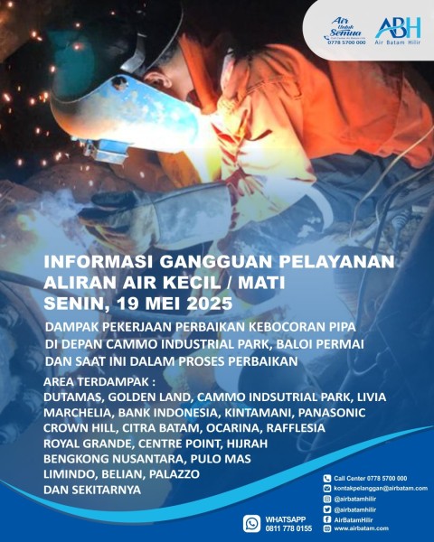 TRANSKEPRI.COM. BATAM - Air Batam Hilir menginformasikan, dampak pekerjaan Perbaikan kebocoran Pipa DN 500mm di Depan CAmmo Industrial Park, Baloi Permai dan saat ini dalam proses perbaikan.