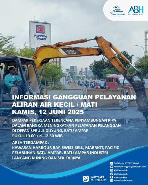 TRANSKEPRI.COM, BATAM - Air Batam Hilir menginformasikan, pelaksanaan pekerjaan terencana Penyambungan Pipa HDPE DN 300mm di Depan SPBU Jl Duyung, Batu Ampar yang bertujuan untuk meningkatkan pelayanan pelanggan dan akan dilakukan pada :