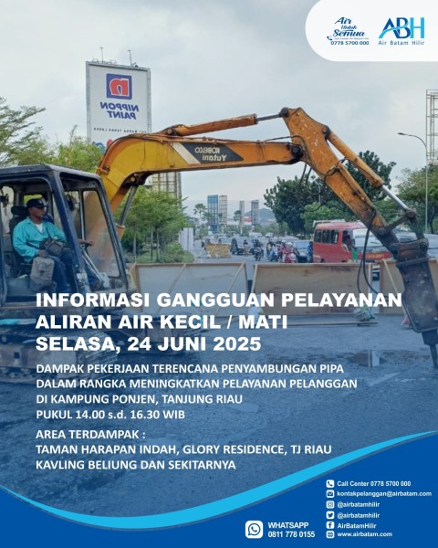 TANSKEPRI COM, BATAM - Air Batam Hilir menginformasikan, pelaksanaan pekerjaan terencana Penyambungan Pipa HDPE DN 160mm di Kampung Ponjen, Tanjung Riau yang bertujuan untuk meningkatkan pelayanan pelanggan dan akan dilakukan pada :