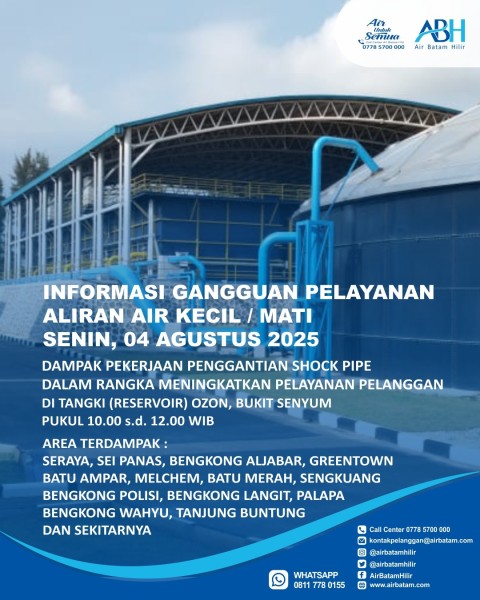 TRANSKEPRI.COM, BATAM - Air Batam Hilir menginformasikan, pelaksanaan pekerjaan terencana Penggantian Shock Pipe di Tangki (Reservoir) Ozon, Bukit Senyum yang bertujuan untuk meningkatkan pelayanan pelanggan dan akan dilakukan pada :