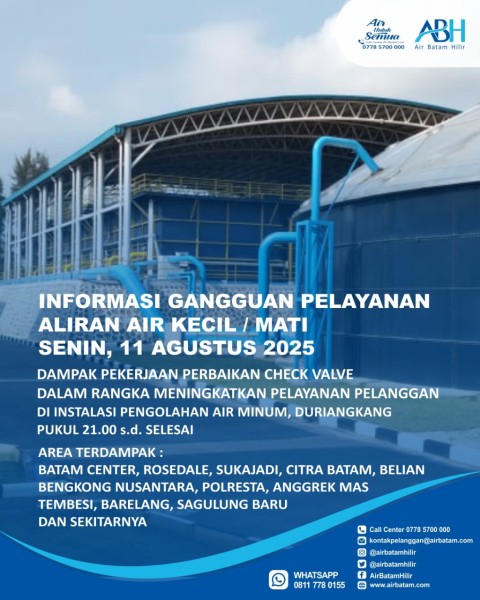 TRANSKEPRI.COM, BATAM - Air Batam Hilir menginformasikan, pelaksanaan pekerjaan perbaikan Check Valve di Instalasi Pengolahan Air Minum, Duriangkang yang bertujuan untuk meningkatkan pelayanan pelanggan dan akan dilakukan pada :