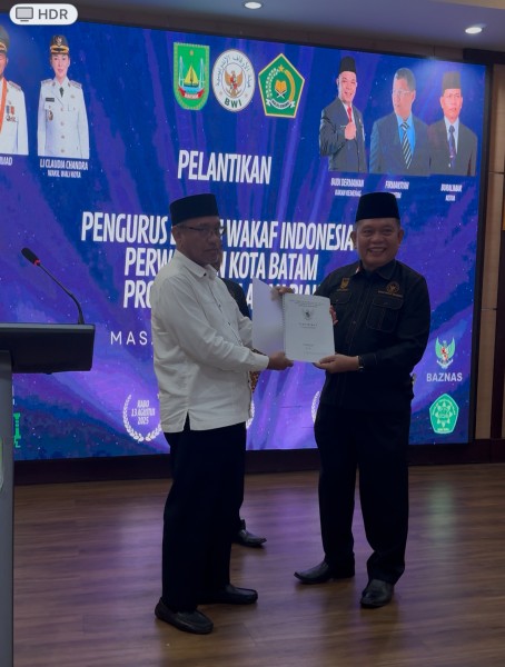 Syamsul Paloh seorang Wakif menyerahkan sertifikat lahan kepada Ketua BWI Batam Drs Buralimar, Rabu (14/08/25) saat pelantikan pengurus BWI Batam di Lantai IV Kantor Pemko Batam. (ist)
