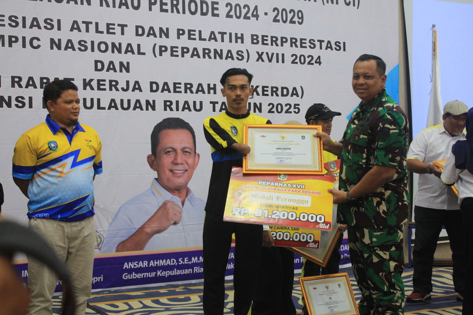Acara ini juga menjadi momen istimewa bagi para atlet dan pelatih yang telah mengharumkan nama Kepri di Peparnas XVII 2024. Kontingen Kepri sukses meraih tiga medali perunggu. Sebagai bentuk penghargaan, para atlet menerima bonus sebesar Rp81.200.000, sedangkan pelatih memperoleh Rp34.200.000.