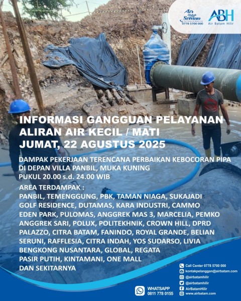 TRANSKEPRI.COM, BATAM - Air Batam Hilir menginformasikan, pelaksanaan pekerjaan terencana Perbaikan kebocoran Pipa Steel DN 600mm di Depan Villa Panbil, Muka Kuning yang rencananya akan dilakukan pada :