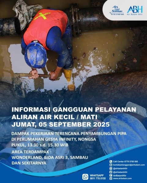 TRANSKEPRI.COM, BATAM - Air Batam Hilir menginformasikan, pelaksanaan pekerjaan Penyambungan Pipa DN 160mm di Perumahan Gesya Infinity, Nongsa yang rencananya akan dilakukan pada :