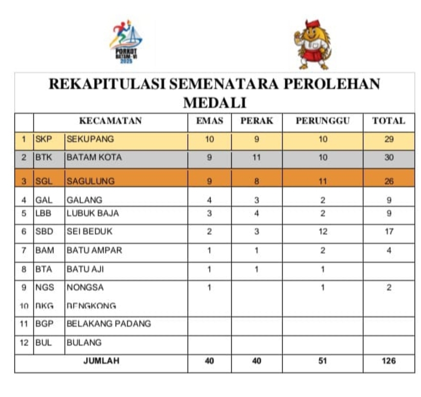 Data resmi dari Ketua Bidang Pertandingan PB PORKOT Batam VI, Daroe Noegroho, mencatat Sekupang berhasil mengoleksi 10 emas, 9 perak, dan 10 perunggu dengan total 29 medali. Capaian ini membuat mereka unggul tipis atas Batam Kota yang membukukan 9 emas, 11 perak, dan 10 perunggu (30 medali).