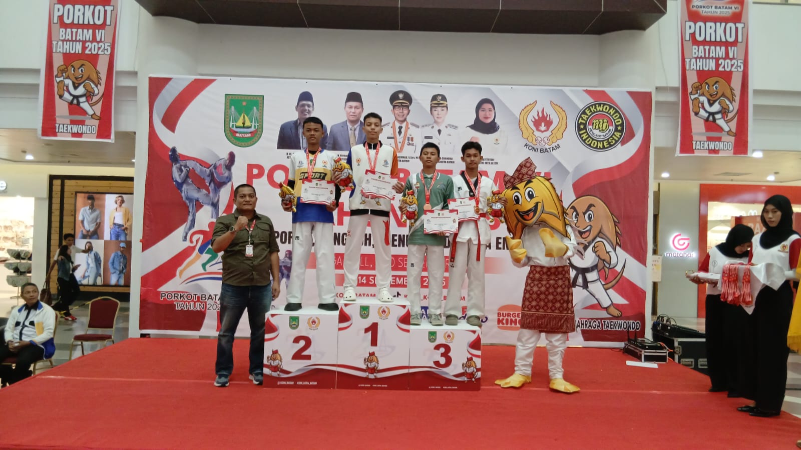 Pertandingan taekwondo PORKOT Batam VI 2025 ditutup dengan seremoni penyerahan medali yang dihadiri Kadispora Kota Batam, Zulkarnain, serta Wakil Ketua I KONI Batam, Rinaldi Samjaya, bersama sejumlah tamu undangan.