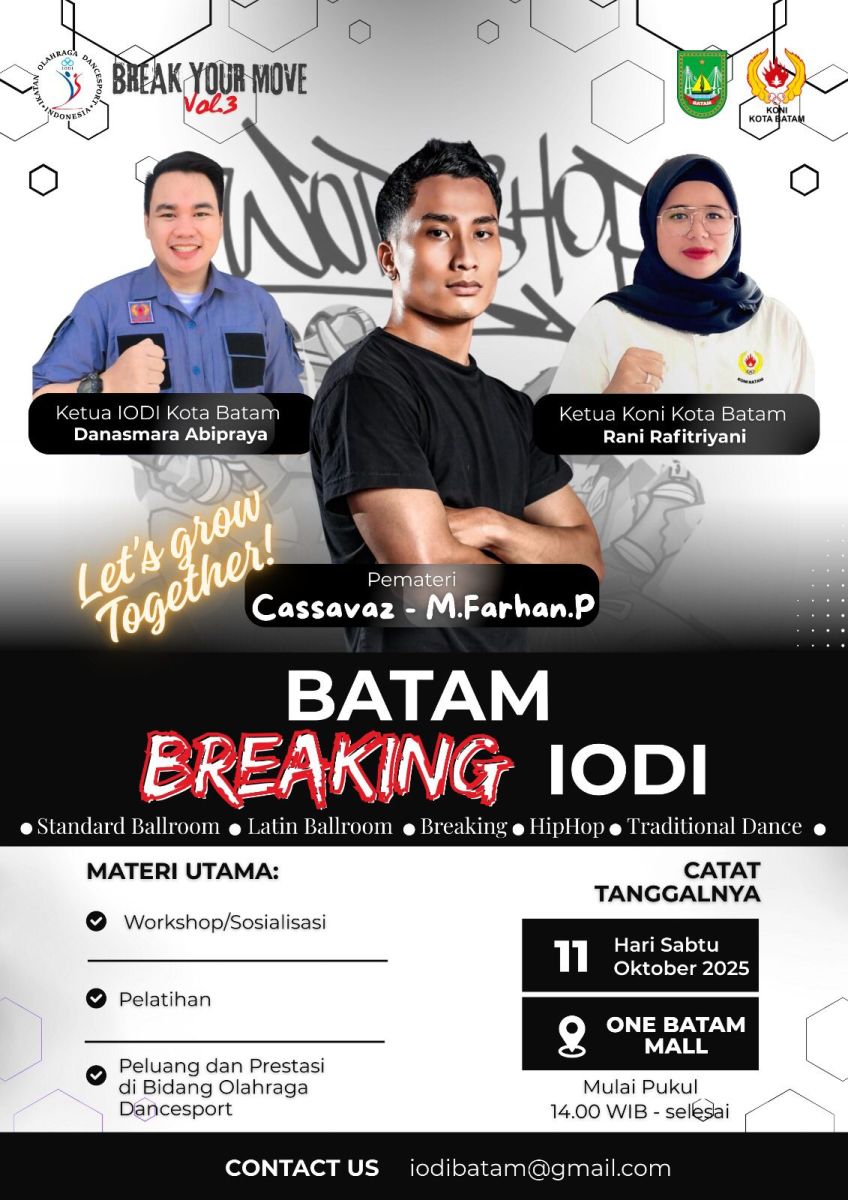 “Kami ingin semakin banyak atlet muda bermunculan untuk memperkuat Kota Batam. Karena itu, IODI Kepri sangat mendukung kegiatan sosialisasi seperti ini agar para pelajar mengetahui visi dan peluang ke depan,” ujarnya. Asmaniar juga menyebutkan bahwa setelah sosialisasi ini, akan digelar workshop breaking pada 11 Oktober 2025, disusul sosialisasi cabang lainnya seperti latin dance, standard ballroom, hip hop, dan traditional dance.