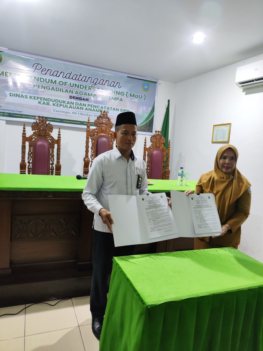TRANSKEPRI.COM.ANAMBAS- Keren, Dinas Kependudukan dan Pencatatan Sipil (Disdukacapil) Anambas gelar Penandatanganan Memorandum of Understanding (MoU) dengan Pengadilan Agama (PA) Tarempa Tentang Percepatan Penerbitan Dokumen Administrasi Kependudukan dan Pencatatan Sipil Bagi Penduduk yang telah berperkara di Pengadilan Agama, di Aula Sidang, Kantor Pengadilan Agama, Senin (6/10/2025).