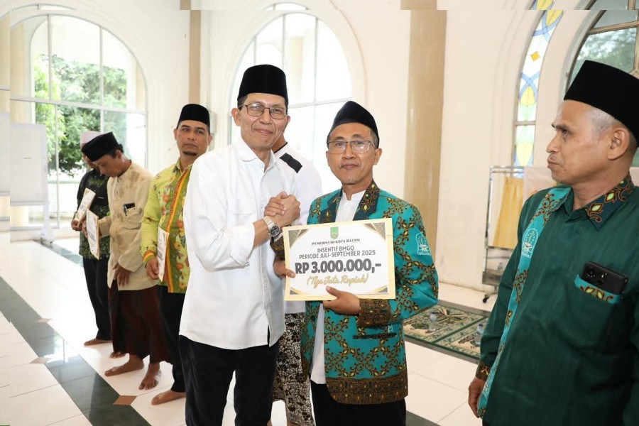 TRANSKEPRI.COM.BATAM - Walikota Batam Amsakar Achmad.menyerahkan secara simbolis insentif bagi tokoh agama yang tergabung dalam Ikatan Persaudaraan Imam Masjid (IPIM), Persatuan Mubaligh Batam (PMB), dan Badan Musyawarah Guru Al-Qur’an (BMGQ) periode III tahun 2025.