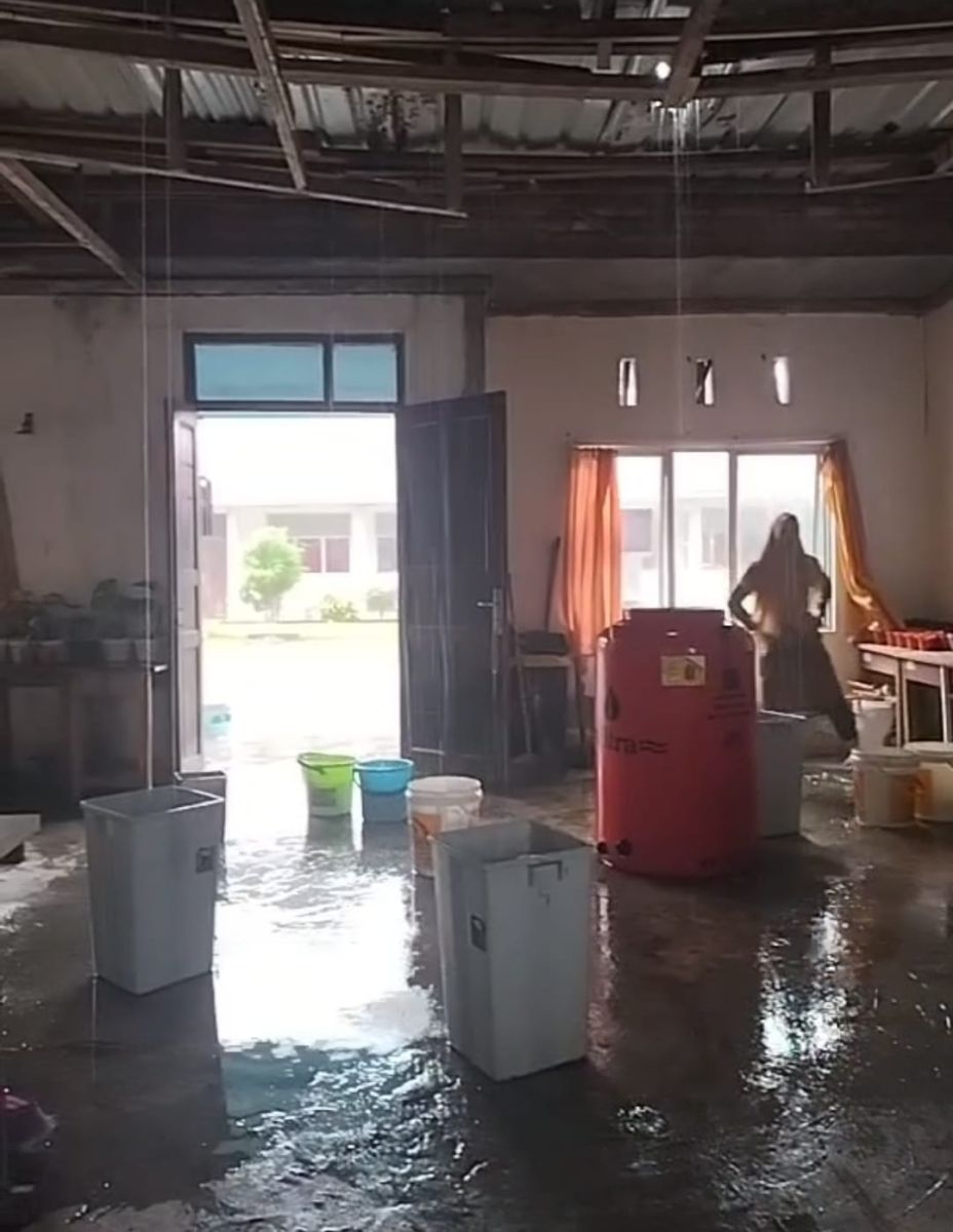 Pantauan di lokasi menunjukkan kondisi bangunan yang sudah banyak mengalami kerusakan. Plafon ruang guru terlihat bolong dan lapuk, beberapa meja ditutupi plastik untuk menahan rembesan air. Tidak ada kabel listrik terpasang, dan halaman sekolah pun tampak sederhana tanpa fasilitas penunjang.