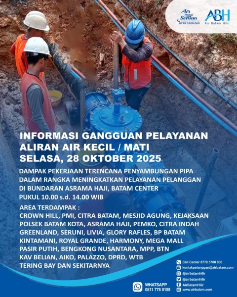 TRANSKEPRI.COM. BATAM - Air Batam Hilir menginformasikan, pelaksanaan pekerjaan terencana Penyambungan Pipa 100mm di Bundaran Asrama Haji, Batam Center yang bertujuan untuk meningkatkan suplai pelanggan dan akan dilakukan pada :