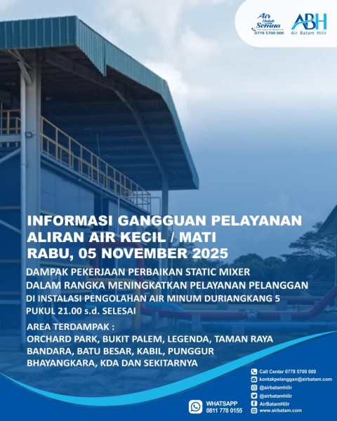 TRANSKEPRI.COM, BATAM - Air Batam Hilir menginformasikan, dampak pekerjaan terencana perbaikan Static Mixer di Instalasi Pengolahan Air Minum, Duriangkang 5 dan akan dilakukan pada :
