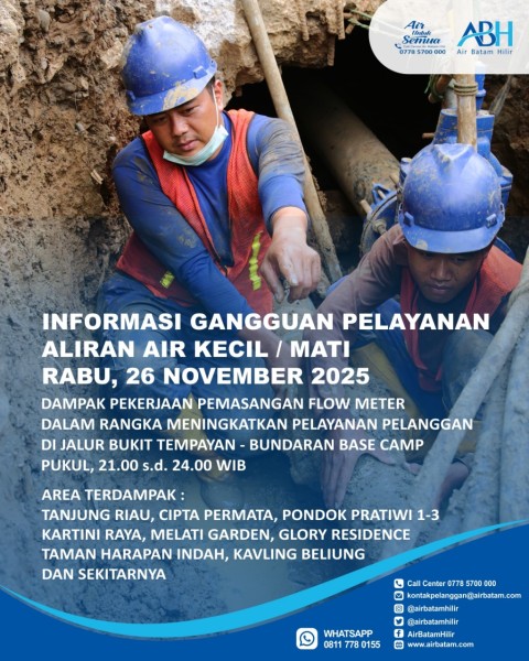 TRANSKEPRI.COM, BATAM - Air Batam Hilir menginformasikan, pelaksanaan pekerjaan terencana Pemasangan Flow Meter DN 300mm di Jalur Bukit Tempayan – Bundaran Base Camp, Batu Aji dan akan dilakukan pada :