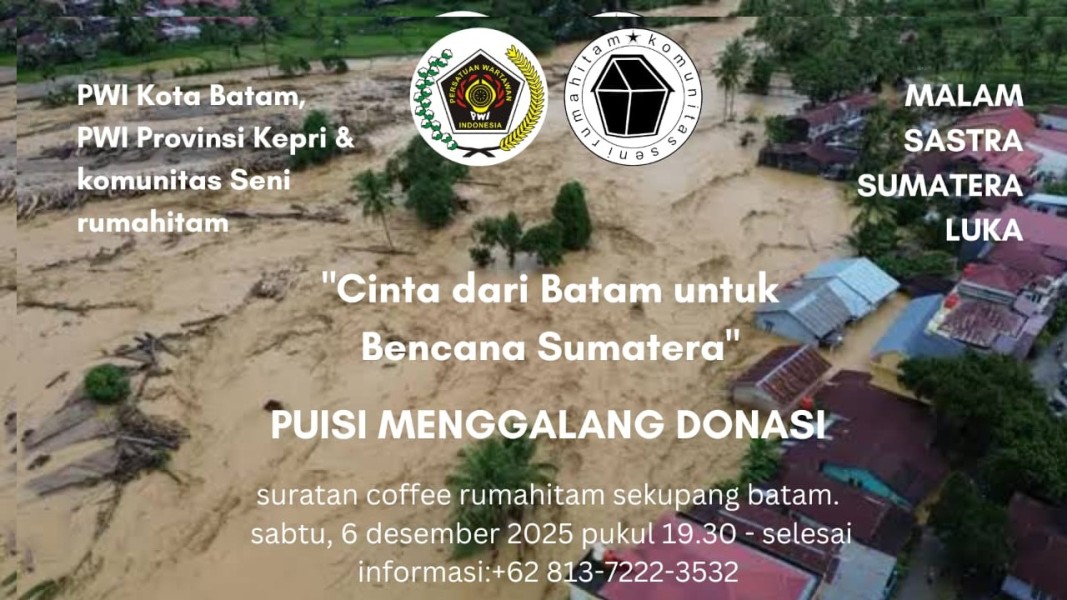 TRANSKEPRI.COM.BATAM - Bencana banjir bandang dan tanah longsor yang melanda Aceh, Sumatera Utara (Sumut), dan Sumatera Barat (Sumbar) mendorong sejumlah komunitas di Batam untuk mengambil inisiatif kemanusiaan. PWI Kota Batam bersama PWI Provinsi Kepri serta komunitas seni Rumahitam Batam akan menggelar sebuah malam amal bertajuk 'Malam Sastra Sumatera Luka'.