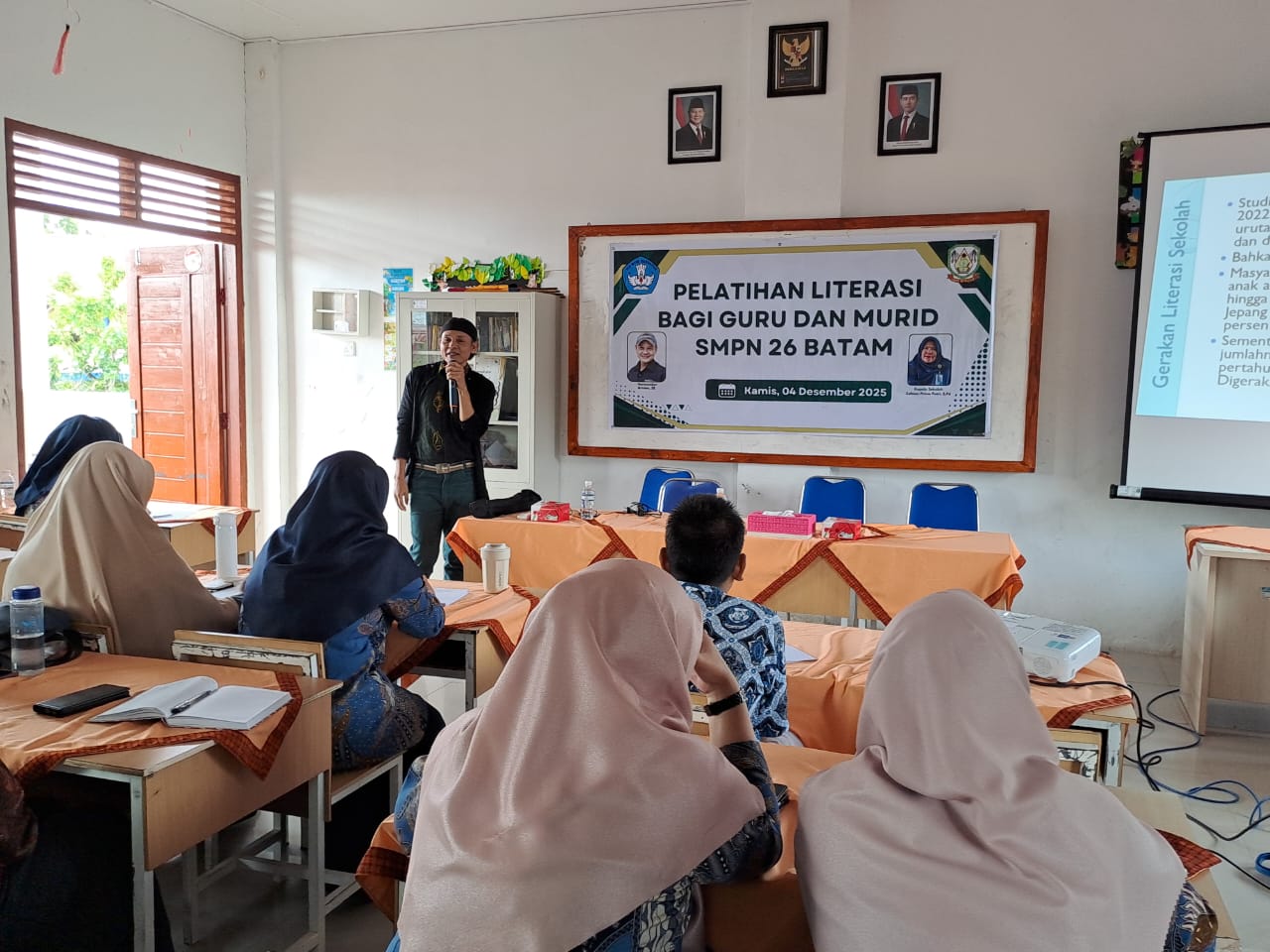 TRANSKEPRI.COM, BATAM – Upaya memperkuat budaya membaca dan menulis di kalangan pelajar terus digencarkan oleh SMP Negeri 26 Batam. Salah satunya melalui pelatihan jurnalistik dan workshop literasi yang digelar di Aula SMPN 26 Batam, Kamis (4 Desember 2025).